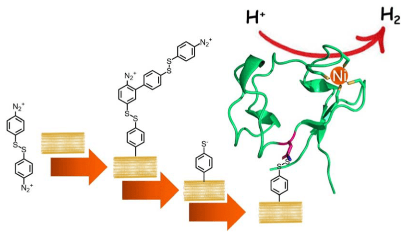 Léonard’s article about an artificial metalloenzyme for hydrogen evolution was published in the Journal of Materials Chemistry A (read his paper here). This paper led by our collaborators Christine Cavazza and Alan Le Goff in Grenoble demonstrates the site-specific attachment of a Rubredoxin protein to a carbon nanotube electrode via diazonium coupling of a thiophenolate. After substituting the Rubredoxin Fe for Ni, the resulting surface-bound artificial metalloenzyme acts as an efficient H2-evolving electrocatalyst with up to 4 mA cm-2 at 800 mV overpotential.