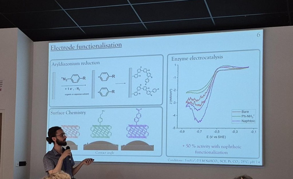 Léonard presented his PhD project on improving the O2-tolerance of electro- and photocatalytic CO2-to-CO conversion by carbon monoxide dehydrogenase (CODH) enzymes through the operation in tailored deep eutectic solvents. During his talk, he showcased promising CO2 reduction data of CODH immobilized on carbon nanotube-based electrodes as well as on functionalized graphitic carbon nitride, increasing their stability towards O2 through solvent tuning.